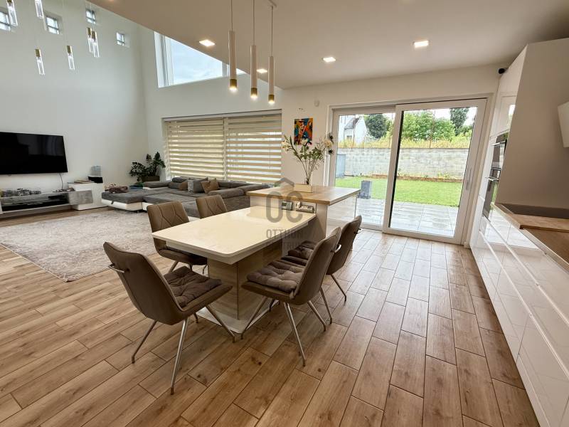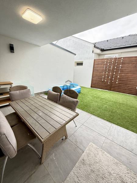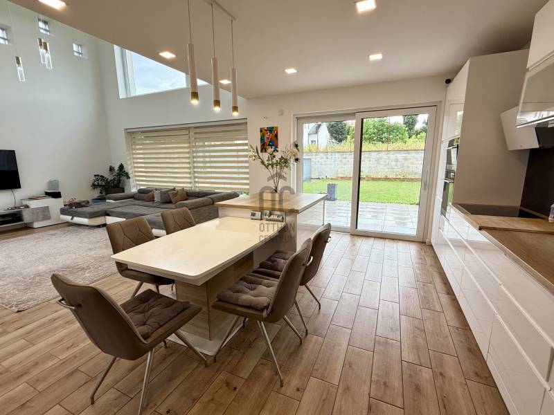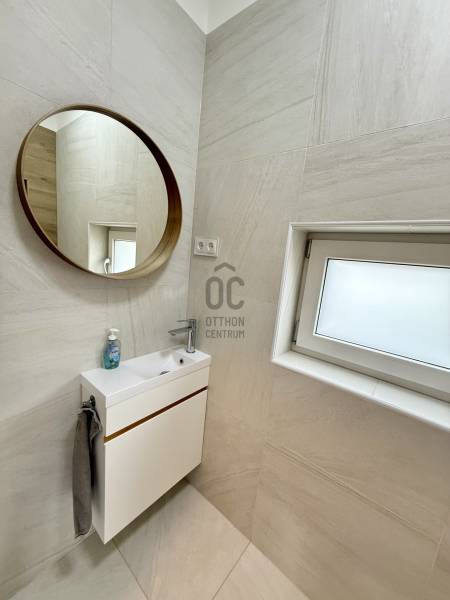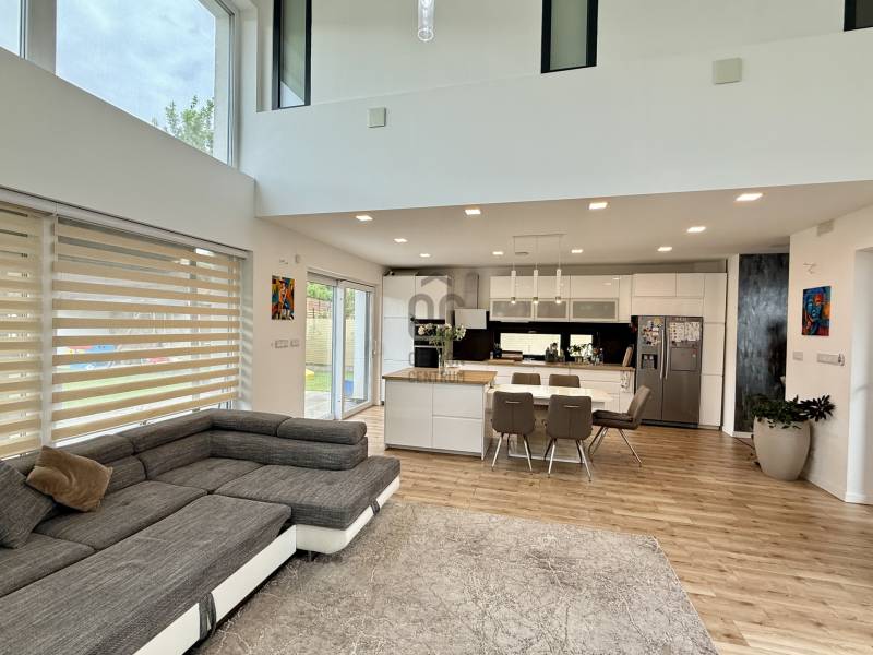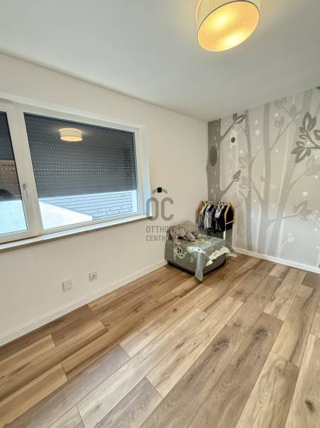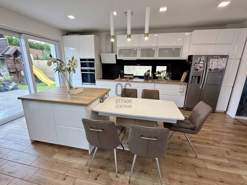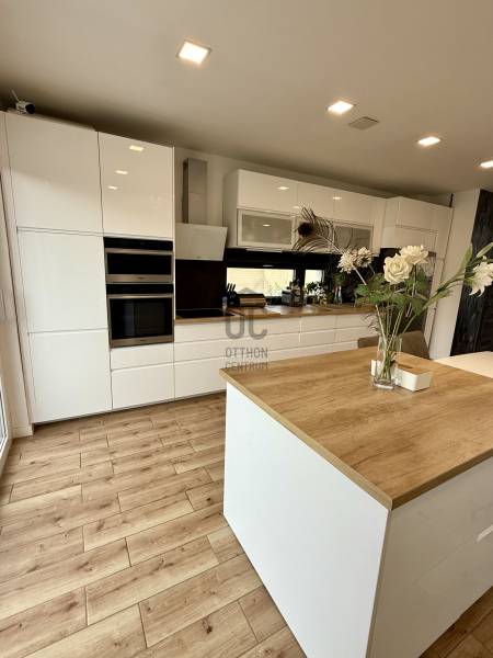 Remek lehetőség családosok számára Üröm csendes, de mégis jól megközelíthető részén!Az átgongolt kialakítású, 2021-ben épült, kétszintes ikerház tágas, nagy belmagasságú amerikai-konyhás nappalija, hatalmas üvegfelületei különleges hangulatú otthont teremtenek.Tökéletes választás lehet minden olyan család számára, akik a kényelmet és a modern életvitel előnyeit keresik. A házban található 2 fürdőszoba, mosókonyha garantálja a kényelmes mindennapokat, míg a tágas nappali és a konyhaszigetes amerikai konyha ideális teret biztosít a közös családi pillanatokhoz. A prémium kivitelezés és a beépített bútorok, szekrények biztosítják, hogy Önnek csak be kelljen költöznie.A ház rezsije nagyon kedvező, melyet a hőszivattyús fűtés , a napelem renszer, a klímák biztosítanak. A hangulatvilágítás valamint a hatalmas üveg felületek pedig a modern otthonok elvárásainak megfelelően varázslatos atmoszférát teremtenek. A nagy belmagasság és a világos terek garantálják, hogy minden szoba napfényben úszik, így az otthon valódi oázissá válik.A különleges beosztású ház nappalija két irányban is kertkapcsolatos, az egyik belső átriumos, intim, és minden időjárásban praktikusan használható mert félig fedett, míg a ház mögött egy terasz kapcsolatos nagyobb kert került kialakításra, ahol még egy kis játszótér is helyet kapott. Automata öntözőrendszer gondoskodik a szép zöld kert fenntartásáról, míg a kerti tároló praktikus megoldást kínál a kinti eszközök és bútorok tárolására. Az elektromos autó töltés lehetősége is adott, így a környezettudatos életmód híveinek is ideális megoldást nyújt.A környék nyugodt, családbarát légkörével, valamint a közeli játszóterek és parkok révén ideális helyszínt biztosít a gyermekek számára a szabadban való játékhoz. A közlekedés szempontjából is kedvező helyzetben található, hiszen a közeli buszmegállók és a könnyen elérhető autóutak révén Budapest belvárosa gyorsan és kényelmesen megközelíthető. Üröm egyre népszerűbb választás a családok körében, hiszen a város zöldövezete és csendes utcái ideális hátteret nyújtanak a mindennapi élethez. Amennyiben felkeltette érdeklődését ez a kivételes ingatlan, kérem hívjon!